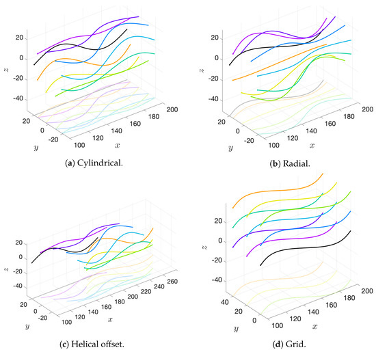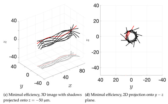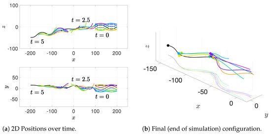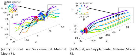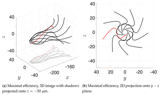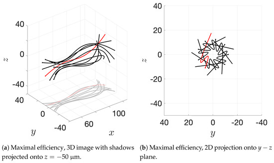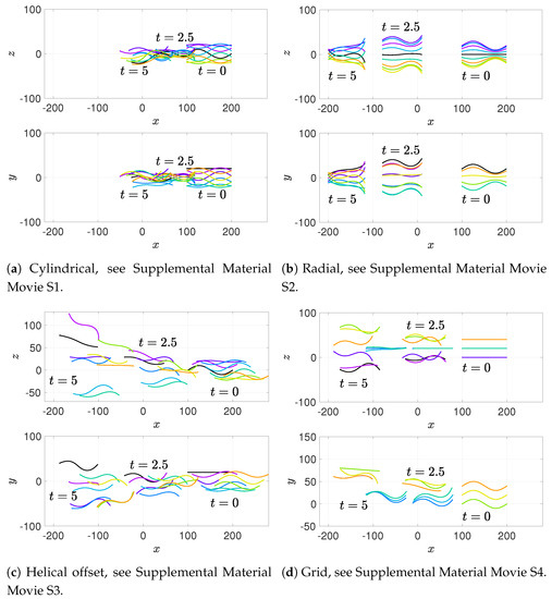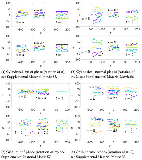 Examples of initial configurations of simulations. For ease of understanding the 3D configurations, we also show the “shadows” of each flagellum on the bottom plane, which is simply a projection of the flagellum onto the m plane. All units are in m and 9 flagella are shown.