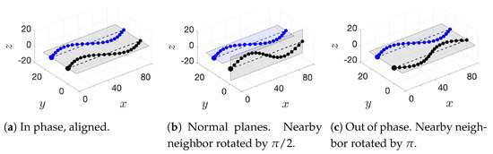 In addition to these basic initial configurations, we also wish to consider phase or alignment differences between flagella. To do so, we rotate nearest neighboring flagella along their centerline axis by one of two angles: