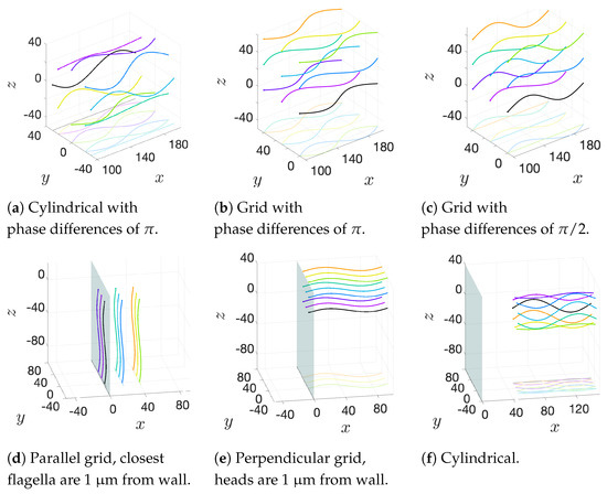 Other initial configurations used. Panels (a–c) shows phase differences between nearest neighbors. Panels (d–f) show configurations with a planar surface (wall) at . All panels have 9 flagella, with the exception of (a), in which 8 flagella are used to maintain the out of phase pattern amongst nearest neighbors. All units are in m.