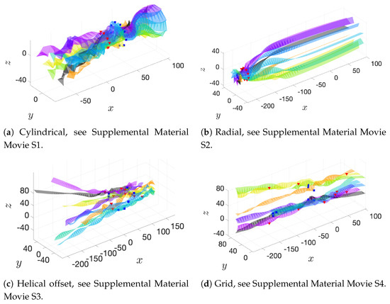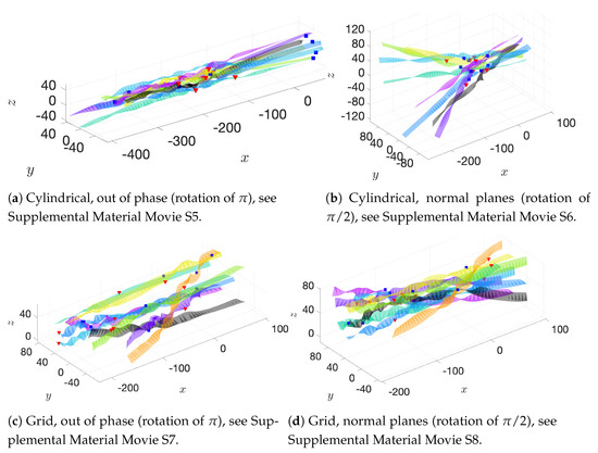 The following are available online at https://www.mdpi.com/article/10.3390/fluids6100353/s1. Movie S1: Cylindrical Configuration. Movie S2: Radial Configuration. Movie S3: Helical Offset Configuration, Movie S4: Grid Configuration. Movie S5: Cylindrical Configuration Phase Shift of . Movie S6: Cylindrical Configuration Phase Shift of . Movie S7: Grid Configuration Phase Shift of . Movie S8: Grid Configuration Phase Shift of . Movie S9: Sperm Train Model. Movie S10: Grid Parallel to Wall. Movie S11: Grid Perpendicular to Wall. Movie S12: Cylindrical Configuration Perpendicular to Wall. Movie S13: Cylindrical Configuration Perpendicular to Wall with Sperm Train. Furthermore, Movie S14: Cylindrical Configuration with No Repulsion Forces (see Appendix A).