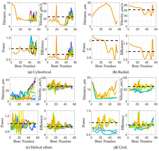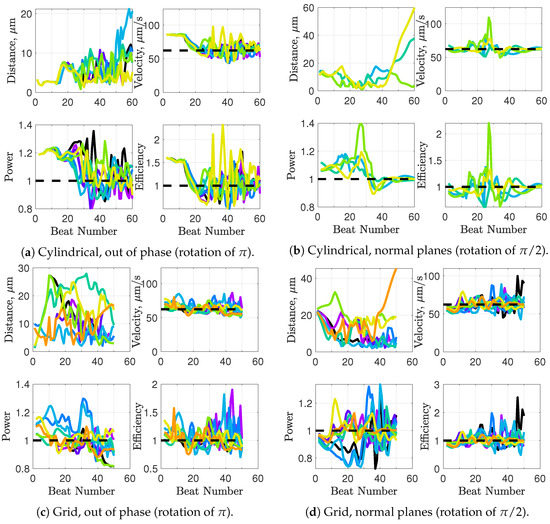 Each simulation was run for many beats (on the order of 50–100) in order to observe motility patterns that arise in populations over long timescales. Movies showing results from all simulations are provided in the Supplemental Materials. In addition to spatial swimming patterns, we computed the average velocity, power, and efficiency per beat as well as the minimal distance between each flagellum and all of its neighbors. Our goal is to understand efficiency and behavior of populations of flagella compared to a single flagellum in free space, so we report all quantitative metrics in reference to a single swimmer in free space.