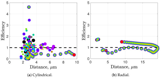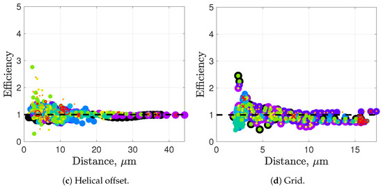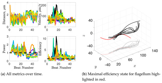 The only discernible differences were that minimal distances between flagella could go below 3 m and in fact got very close to 0, as seen in Figure A1f, and metrics such as velocity and efficiency were higher (see Figure A1e). Because the repulsion force was designed to push flagella apart if they are within 3 m of each other, it is expected that removing it would allow for flagella to get infinitesimally close to each other. Additionally, repulsion forces move the flagellum away from its preferred curvature configuration, which will stifle the sinusoidal motion that propels the flagellum forward. Therefore, we would expect a repulsion force would reduce velocities and efficiencies. Conversely, removing a repulsion force would allow for more freedom of motion and therefore an increase in velocity and efficiency would be expected.