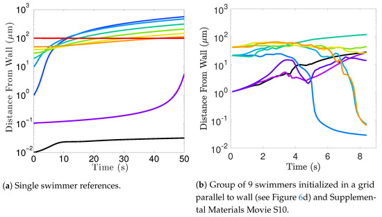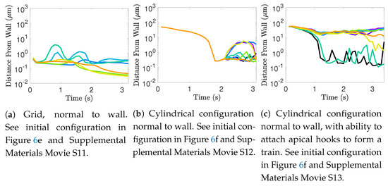 To ensure that the inclusion of the repulsion force defined in Equation (9) did not significantly affect behavior of flagella in simulations–particularly those in which attraction of flagella was observed and distances between flagella got small–we ran a simulation without repulsion forces included. The results are summarized in Figure A1. The general pattern of behavior was nearly identical to simulations that had repulsion forces in them. Supplemental Material Movie S14 shows a full simulation for a cylindrical configuration.