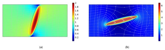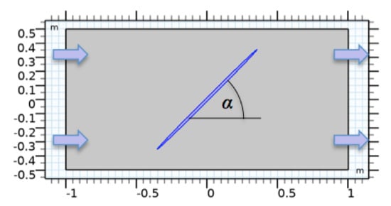 We examine scenarios in 2D of a single crack of elliptic shape in a porous medium (matrix). The constellation is sketched in Figure 1, which shows the entire model region in grey and the crack in blue. The crack is assumed to have the shape of an ellipse, a concept that can be found in many studies on the mechanics of fracture propagation and closure [,], but that has been adopted in the hydro-sciences [,]. The main axis of the ellipse forms an angle α with the flow direction. There are two opposite sides without normal fluxes, neither for fluid nor for solute or heat (in the sketch the horizontal sides). The other sides of the region are open, and the conditions are chosen to induce inflow on one side and outflow on the opposite one. The boundary conditions are chosen in a way that they would induce a 1D constant flow field in a set-up without the crack.
