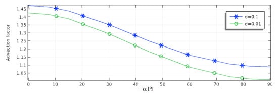 Advection factor as function of the crack angle for d = 0.1 and d = 0.01; Re = 10, Da = 10−11.