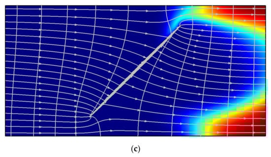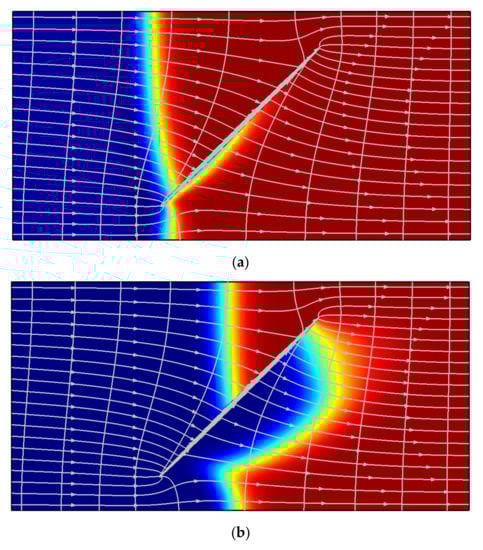 Flow in the combined matrix-crack system was modelled assuming Darcy flow in the matrix and Stokes flow in the crack. The relevance of the inertial term in the Navier–Stokes Equation (2), as discussed above, was scrutinized. A graphical representation of selected results is depicted in Figure 3, showing velocity magnitude as a colormap, as well as flow paths and contour lines of the hydraulically relevant pressure p.
