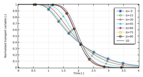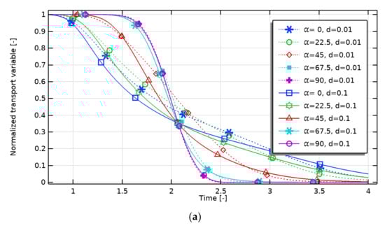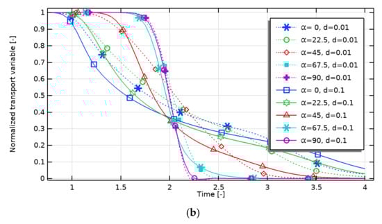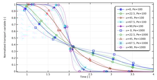 The Pe-number is a measure for advection dominance. Higher gradients can be expected for higher Pe. Comparing both plots in Figure 9 with different degrees of advection-dominance confirms the expectation. The plots also show that there is an effect on the arrival of the mean concentration, which is an indicator for advection. A shift to earlier arrival can be observed, which indicates an additional effect on advection. While this shift is very small for cracks that are perpendicular to flow (α = 90°), it becomes more pronounced with decreasing angles. This shift depends on α and d, but less on Pe.