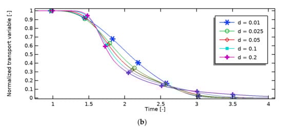 Breakthrough curves as function of aspect ratio d; for cracks with α = 45°, Re = 1, Da = 10−14; (a) for Pe = 33.3, (b) for Pe = 333.