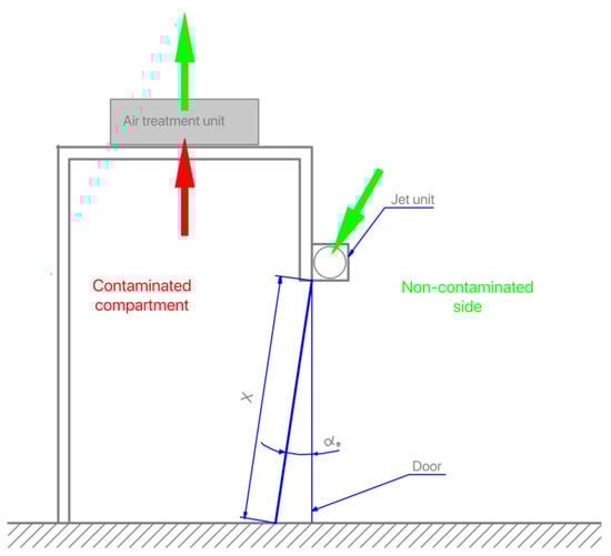 - It was considered that the physics in the case of the “contaminated” compartment, presented in Figure 1, is relevant for analysis of the performance of the air curtain device.