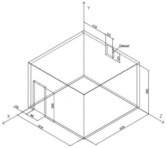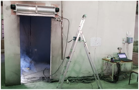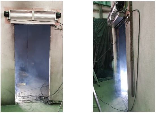 The same test rig and the same procedures of the tests reported in [] were used; therefore, this section of the methods is similarly described. The measurement uncertainty analysis for this test rig has already been presented in []. The compartment presented in Figure 2 was built for assessing the aerodynamic sealing of a full-size air curtain. The walls were composed of a double 10 mm thick gypsum board with a 50 mm insulation layer inside. To avoid wind disturbances, the experiments were performed in a hangar. Indoor air and cold smoke were exhausted by a fan via a 625 mm × 535 mm opening, which was located near the ceiling in the opposite wall to the door. The exhaust fan was controlled by a variable-frequency drive, and the exhaust volume flow rate at the compartment exhaust opening was correlated by calibration with the displayed frequency (the estimated standard uncertainty of the measurement varied from 0.055 m3/s, for a low flow rate, up to a maximum of 0.084 m3/s, for a flow rate of 0.97 m3/s). The maximum flow rate of the exhaust fan was 0.86 m3/s in these tests. The average door velocity was estimated based on the continuity in relation to exhaust flow rate.