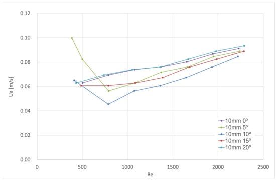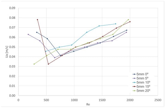 The following figures (Figure 6, Figure 7 and Figure 8) show the relevant experimental results for the 5 mm, 10 mm and 16 mm jet thicknesses. The x-axis corresponds to the plane jet Reynolds number and the y-axis corresponds to the minimum average velocity through the door to obtain the visual aerodynamic sealing. Every figure presents the results for several angles (0°, 5°, 10°, 15° and 20°) between the plane jet and the vertical plane. As the tests for the nozzle thickness of 16.6 mm and angle of 15° were carried out for a wide range of Reynolds numbers, two images present the results: the upper image in Figure 8 shows the whole set of results and the lower image shows the test results for the Reynolds number interval from 0 to 2400.