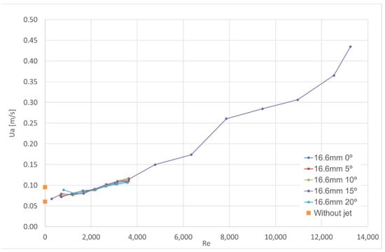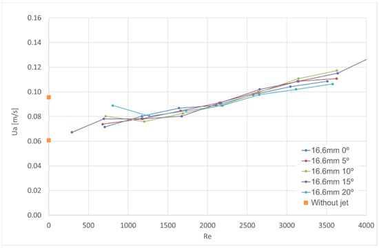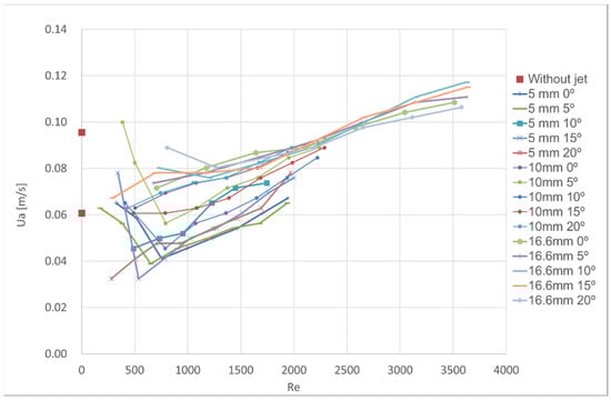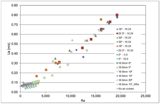 The paper [] presented the results corresponding to the lowest exhaust flow rate necessary to obtain the aerodynamic sealing (assessed visually) in full-size isothermal tests for the jet nozzle thickness of 16.2 mm, for the jet angle varying from 22.5° and 30° and for Reynolds numbers in the range of 6500 to 19,400. That paper also presented test results where particulate matter sensors had been positioned inside and outside the compartment to assess the particulate matter concentration inside and outside. The ratio between outside and inside concentration was analysed to assess the aerodynamic sealing of the air curtain. In those experiments, different extract flow rates were used to obtain variable aerodynamic sealing. For every set of tests (with the same angle, the same thickness and the same velocity), only the results of the test with the lowest exhaust flow rate for the best aerodynamic sealing were considered. In the final presentation of the test results, the average velocity through the door replaced the exhaust flow rate. This replacement was made to present the results using only local quantities directly influencing the flow at the door protected by the air curtain. This set of results is reproduced in Figure 13, together with the test results presented previously in this paper for the thickness of 16.6 mm and jet angle ranging from 0° to 20°.