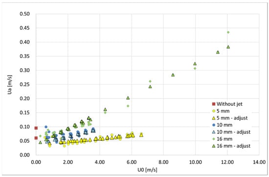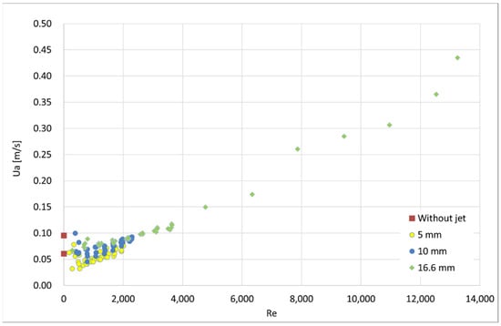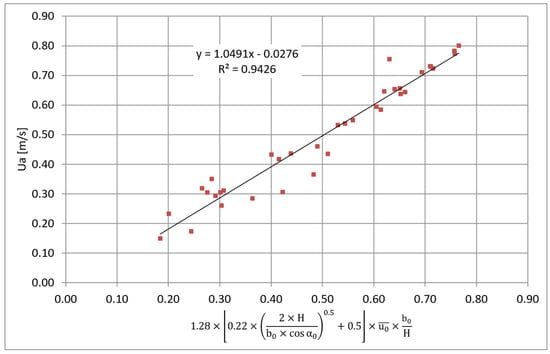 Figure 12 presents a graph with the experimental results, with the average flow velocity at the opening () as a function of the jet velocity at the nozzle () compared with the predictions obtained with Equation (3).