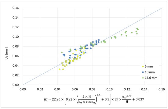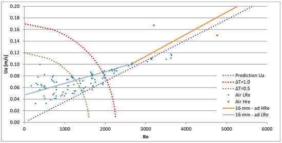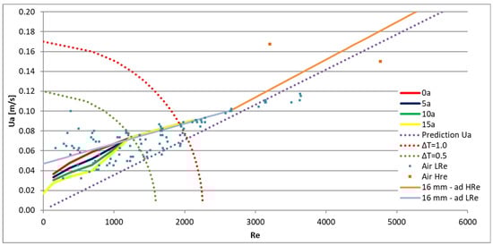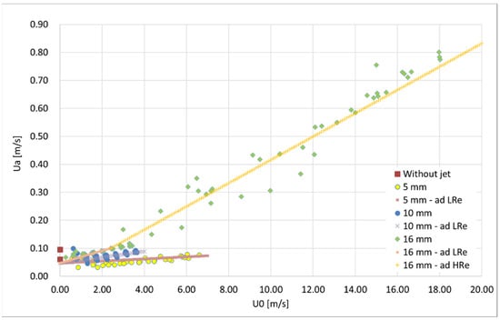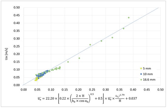 Using previous small-scale saltwater test results [], the average velocity of the flow through the door, , which is necessary to avoid contaminant transport through the plane jet, was related to the plane jet characteristics by Equation (6). Although the effect of buoyancy was important in these tests, the behaviour shown by Equation (6) only corresponds to the intrinsic characteristics of the jet, as presented in Equation (1) and subsequent equations. The comparison of the curves obtained with Equations (4) (named “16 mm—ad HRe” in the figure), (5) (named “16 mm—ad LRe” in the figure) and (6) (named “Prediction Ua” in the figure) is presented in Figure 17 [], together with the test results. Figure 17 confirms that the curves of Equations (4) and (6) show a similar trend.