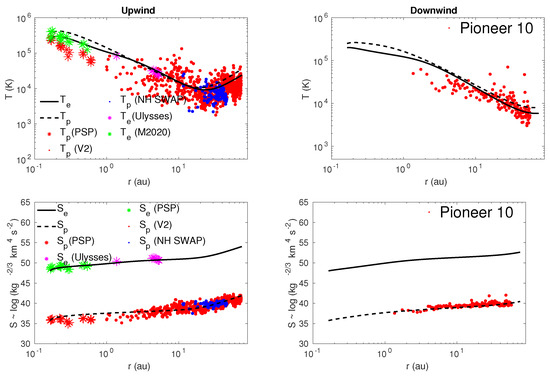 Top left and right: Comparison between the theoretical and observed solar wind proton and electron temperatures as a function of heliocentric distance in the upwind and downwind directions. Bottom left and right: Comparison between the theoretical and observed proton and electron entropy as a function of heliocentric distance in the upwind and downwind directions. The solid and dashed curves show the solar wind proton and electron temperature, respectively. The red and green “*” symbols indicate the proton and electron (M2020) Moncuquet et al. [119] temperatures measured by PSP in the outbound direction during its first encounter. The magenta “*” indicates the electron temperature measured by . The red “.” symbols on the left and right panels indicate the proton temperatures measured by 2 and 10, respectively. The blue “.” indicates the proton temperature measured by NH SWAP.