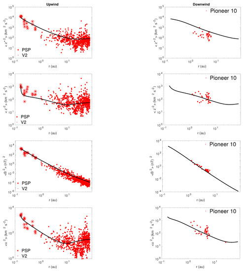 We solve the coupled Equations (10)–(16) using a Runge–Kutta fourth order method over the distance of the perihelion of the first orbit of the PSP (i.e., 0.17 au) to 75 au in the upwind and downwind directions. The boundary conditions are shown in Table 1, and Table 2 shows the parameter values used in the model for the upwind and downwind directions. The parameter values are chosen so that the theoretical results are consistent with observations. We find that other choices of the parameters yield results that do not fit the available observations very well. However, a detailed analysis of the possible parameter set and its statistical fit to the available data sets has not yet been undertaken. How we derive the observed turbulent quantities can be found in our series of papers [16,17,18,44,76,91].