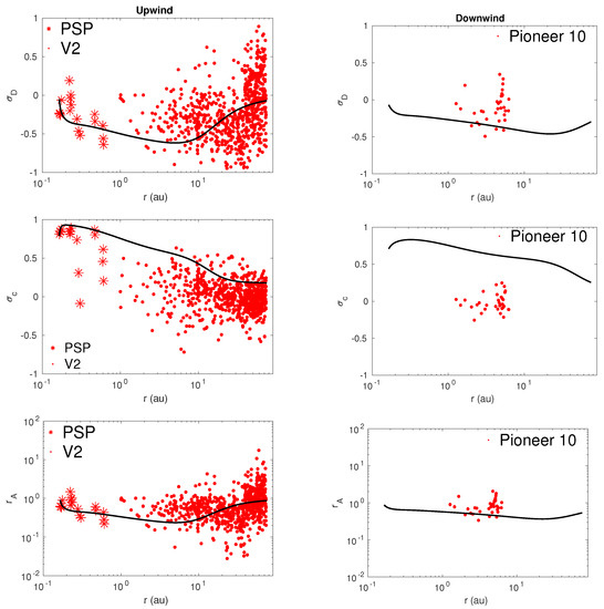 From top to bottom in the upwind direction (left column) and the downwind direction (right column), the theoretical and observed normalized residual energy, normalized cross-helicity, and Alfvén ratio are compared as a function of heliocentric distance. The solid curves denote the theoretical results. The red “*” and “.” symbols represent the PSP and 2 measurements, respectively.