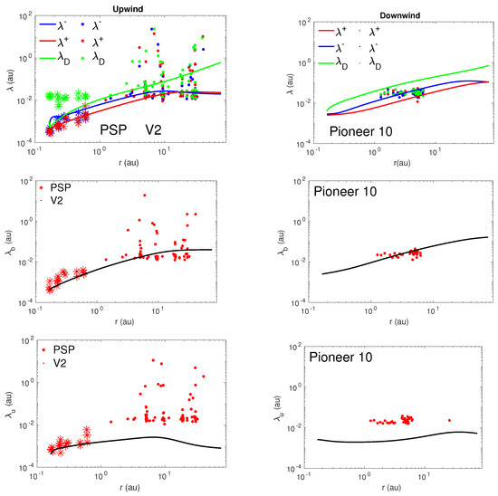 From top to bottom in the upwind direction (left column) and downwind direction (right column), the theoretical and observed correlation lengths corresponding to forward and backward propagating modes and the residual energy (top panel), correlation length of magnetic field fluctuations (middle panel), and correlation length of fluctuating kinetic energy (bottom panel) are compared as a function of heliocentric distance, respectively. The solid curve denotes the theoretical correlation length. In the left column, the red, blue, and green “*” and “.” symbols represent the and 2 measurements, respectively. In the right panel, the red, blue, and green “.” symbol represents the 10 measurements.