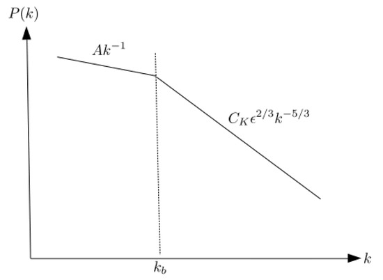 The second approach is based on the use of a dimensional analysis [136] to derive the turbulence cascade rate. Figure 5 is a schematic diagram, illustrating the power spectral density (PSD) of Elsässer energies , turbulent magnetic energy density , and the turbulent kinetic energy as a function of wavenumber k, where defines the power spectrum in the energy-containing range, and the power spectrum in the inertial range. The parameter A needs to be determined, is a Kolmogorov constant, and is the turbulence cascade rate. The wavenumber separates the energy-containing range and the inertial range. Since the PSD in the energy-containing range is equal to the PSD in the inertial range at , we can write