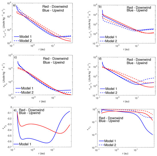 In Equations (15) and (16), represents a turbulent heating term, which is distributed between electrons and protons. For example, it is thought that 60% of the turbulence energy heats solar wind protons [11,100], and 40% heats solar wind electrons [11]. We assume throughout the helioshere [11]. However, a few authors also assumed that [102,116,117]. The turbulent heating term can be derived from a von Kármán–Taylor phenomenology, and is given by [23,34],