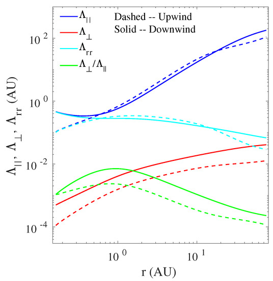 For the perpendicular diffusion of energetic charged particles, we use the NLGC theory [158]. If turbulence is assumed to be entirely slab [162,163] or if the Kubo number [164] of the turbulence is small [165], the original NLGC theory produces inaccurate results. There are more sophisticated extensions of NLGC theory [166,167,168]. Shalchi [166] introduced an important extensions of NLGC theory, namely the unified nonlinear theory (UNLT), which addresses the weaknesses of NLGC theory. Turbulence responsible for the scattering of charged particles can be described as the superposition of a dominant 2D component and a minority slab component [41,43,44,154,155,156], in which case UNLT theory and NLGC theory give very similar results. If the turbulence models do not contain a dominant 2D component, the UNLT theory should be used instead of NLGC theory. In this work, we use a 3D incompressible MHD transport model to describe but to mimic the anisotropic character of solar wind turbulence, we decompose the magnetic energy density into a quasi-2D and a slab component in the ratio 80:20, i.e., 2D turbulence energy ), and slab turbulence energy ). Theory and observations predict that the ratio between the 2D and slab turbulence energy is 80:20 [62,103,169,170]. Similarly, we assume to calculate the 2D () and slab () magnetic correlation length, where is the magnetic correlation length. Zhao et al. [43,44] have used a NI MHD turbulence model Zank et al. [78] to investigate the CR diffusion tensor throughout the heliosphere. The WKB model for Alfvén waves was used originally to study the radial and latitudinal dependence of the CR diffusion tensor [171,172].