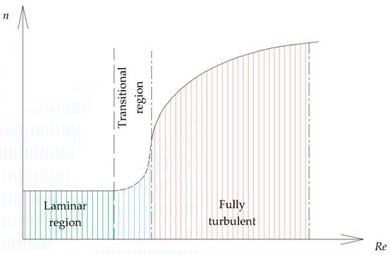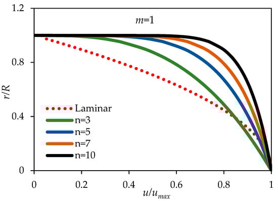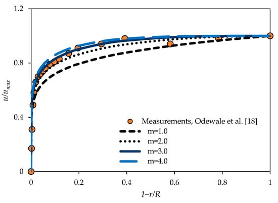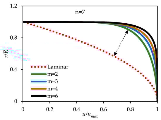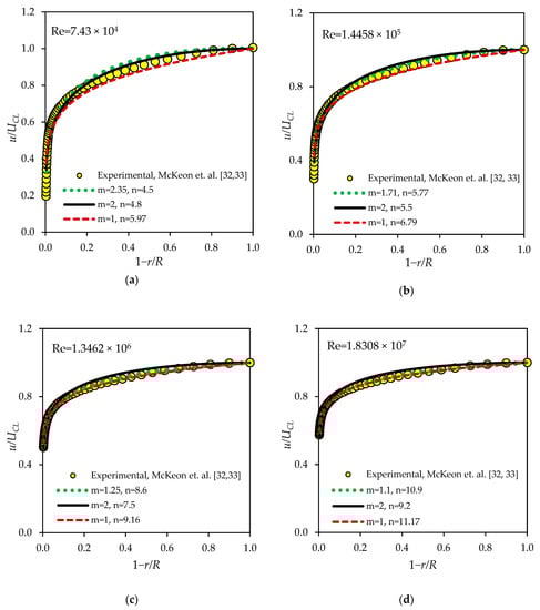 The previous discussion and comparisons suggest that a new power law velocity profile that covers a wider range of Re would be one that incorporates two fitting parameters as given in Equation (15). With the parameter m varying over a smaller range, it may be possible to lump it into a single value that spans the whole spectrum of Re. A value of 2 seems reasonable as it maintains the continuity of derivatives and reduces to the laminar profile for smaller Re.