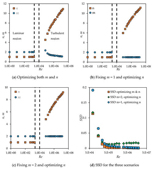 It is seen from the figure that, for larger values of Re, the three scenarios result in a smaller SSD, which implies good fitting. The best fitting, however, over the whole spectrum of Re, in the turbulent region, is that corresponding to optimized m and n values. However, since the parameter m changes over a smaller range, it is reasonable to take a fixed value of m to represent the whole range. A value of 2.0 for the parameter m not only maintains the continuity of the derivative at the centerline but also reduces to the laminar profile when n is 1.