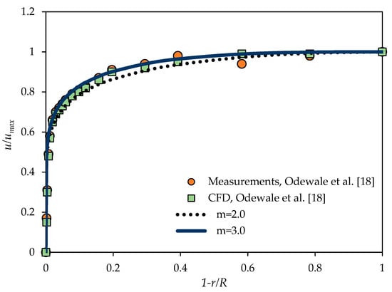 Figure 11, on the other hand, depicts comparisons between the measured, computed using CFD analysis, and computed using the proposed generalized power law velocity profiles. Two values of the exponent