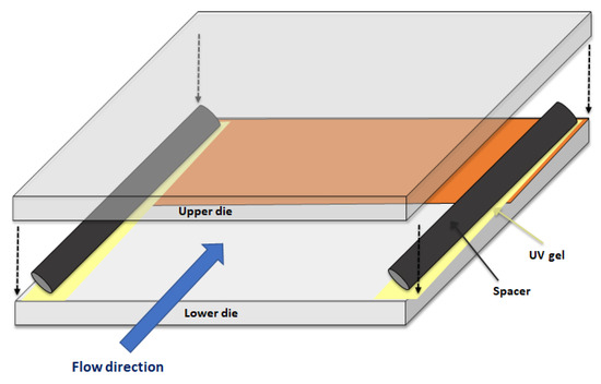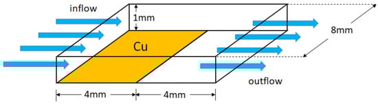 To fabricate the test vehicle, a 4 inch glass wafer was first sputtered with 30 nm chromium and 200 nm copper which served as an adhesion layer and seed layer, respectively. The wafer was then diced into each 8 mm × 8 mm glass dies. To ensure a significant comparison between the regions being plated or not, each test die was half immersed in SPS () solution and hydrochloric acid to remove the copper and chromium layer. The glass die turned out half transparent and half coated with copper where the electroless copper plating took place. Thereafter, a fully transparent glass, which was identical to the size of the test die, was face-to-face aligned and bonded via using a flip-chip die-bonder in order to obtain a clear observation view. Two tungsten wires which were 8 mm in length and 2 mm in diameter were glued by UV gel and placed on the periphery of the test die for the purpose of restricting the flow direction and defining the height between the dies (see Figure 18).