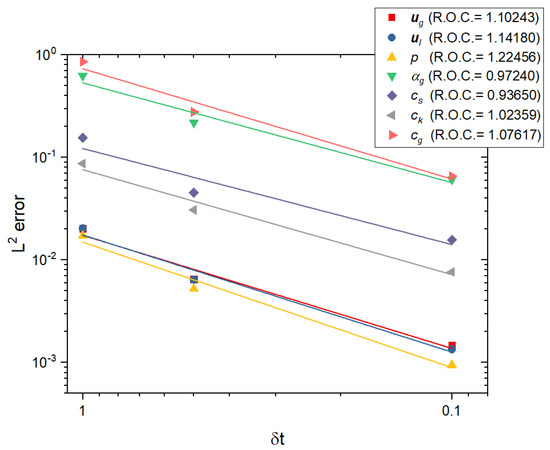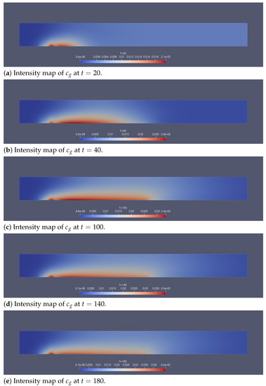 With and uniform mesh, it took 5832 s to reach the final time with an Intel Core i7-8750H @ 2.20 GHz. During the computation, it took of the total CPU to solve the volume fraction problem, to solve the chemical species transport problem, and to solve the two-velocities/pressure flow problem.