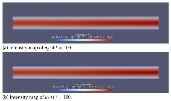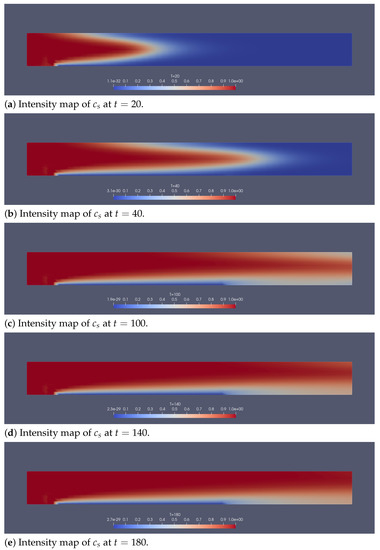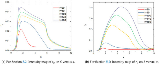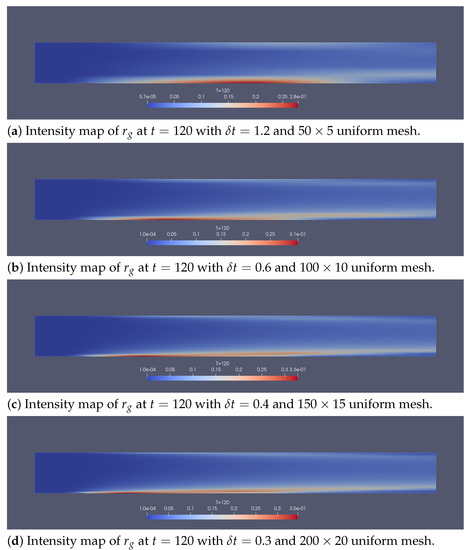 In Figure 12a,b the velocity vector fields and are seen to be almost parabolic in y (Poiseuille flow), but the phase change and moving boundary induce a non-zero asymmetric vertical component (see Figure 15); both play important roles for the bubble distribution. Bubble density can be inferred by analyzing and (see Figure 3). The color maps of Figure 13 display a high gas volume fraction area near the top and bottom plates. Figure 14 shows how the steady state is established and how the electrolyte disappears in the plating region due to the plating. Figure 2 displays a high volume fraction of the gaseous phase near the reacting surface. The deposition-induced movement of S is presented in Figure 17. Figure 3b shows that the region of highest bubble density is moving away from the inlet as the electroless plating proceeds.