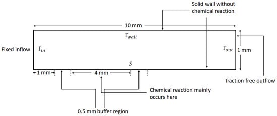 The computational domain for the test problem in Section 5.2 is initially a rectangle of size 10 mm × 1 mm. We assume a fixed inflow velocity and given chemical concentrations from the left on , a solid wall on the top side with a no-slip condition for the velocity, and a traction-free outflow on . On the bottom side, is a free boundary and its motion is given by (23). However as the reaction site is active mostly for (1.5 mm, 5.5 mm), we may block the chemical reactions for mm to avoid a corner singularity at the entrance and also for mm because experiments show that almost no plating occurs there. In the regions (1.0 mm, 1.5 mm) ∪ (5.5 mm, 6.0 mm) the numerical simulations may not be accurate due to the singularity caused by the discontinuity in the boundary conditions (see Figure 3 for details).