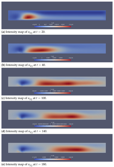 - Stability of the scheme for and is a consequence of a similar argument combined with the Ladhyzenskaya–Babuska–Brezzi saddle point theory (LBB) [46].We denote by the inner product. For tensor-valued functions such that , , . With self explanatory notations, the equations for the velocities (32) and (33) are written in variational form as:Find and p satisfying the Dirichlet conditions and such that, and ,where, for , ,and where . Here is the subspace of of functions which are zero on the Dirichlet boundaries.Note that the above is a semi-linearization of (32) and (33). However in Algorithm 1 below, the nonlinear problem is solved by an iterative fixed point which uses (41) and (42).The LBB theorem says that the solution of (41) exists and is unique because, for every there is a (non-unique) withprovided that Let us show stability in the special case because one can always subtract from so as to work with and .Thus, setting , and leads toBy the same argument used above, it implies that is bounded. Indeed, assuming ,for some generic constant C depending on and . Finally, we obtainwhereThis estimate would be optimal if the constant C did not depend on the Hessian of the velocities. This is a drawback of the characteristic method and of the unsophisticated treatment of the nonlinearity. At the expense of long mathematical arguments it could be fixed as in [34], the scheme would be stable.