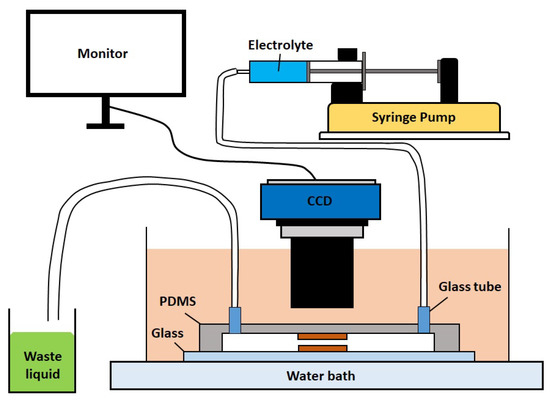 An electrolyte with copper ions and formaldehyde flows in micro-channel between two parallel glass sheets (Figure 1). One piece of the sheet is partially glued on a copper plate whose longer side coincides with an edge of the inlet. Electroless copper plating was conducted in a water tank controlled at 50 °C with in situ recording via stereomicroscope (charged coupled device 311 digital camera CCD).