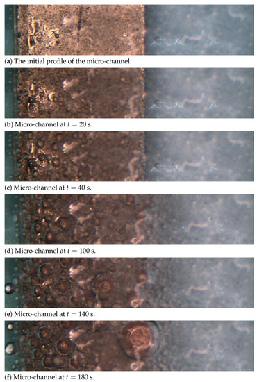 For an electroless plating process accompanying gas generation, the bubble distribution with respect to time, in the micro-channel, is the most important index for evaluating the quality of deposition. To measure it quantitatively, a high-quality optical system installed in the micro-channel is indispensable. For example, several types of fiber optical probes have been used to measure the particle (or bubble) size and distribution in a channel flow (or micro-channel flow) [53,54,55,56]. However, such an optical system is difficult to install in our case because there is no appropriate place to set up the light source and the detector in the micro-channel. The signal interference caused by the copper plate or glued gel on two sides is almost inevitable.