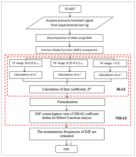 The process of faulty and feature extraction of the pressure transient signal begins with decomposing the signal into a series of Intrinsic Mode Functions (IMF) through Empirical Mode Decomposition (EMD) and computing the NIKAZ coefficient value of every series of IMF. The IMF containing the highest NIKAZ coefficient is then further used for the HT. The detailed process of the proposed method is shown in Figure 1.