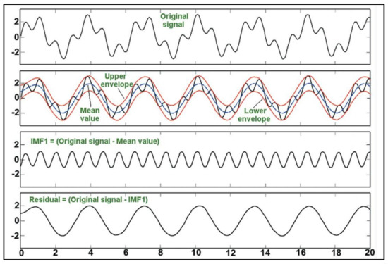 By the sifting process [14], the procedure described should be responsive. This phase is supposed to introduce the IMF definition [25]. With just the summing-up of all the IMF elements, the raw signal can be reconstructed. This paper prefers that all the IMF modes generated by this phase should be almost monochromatic and can be used to make an important determinant of the instantaneous frequency of the signal. Afterward, all maxima values are interpolated through a spline (smax(t)) and then the same process is done for minima (smin(t)) [18]. The boundaries of signal x(t), which includes all points of signal, are two segment lines, the regions between two curves. The interpretation of the interpolation of splines and the extraction of a mean function m(t) can be obtained from the initial signal x(t).