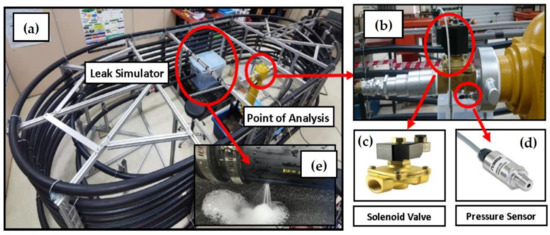 The laboratory experimental set-up: (a) Pipe loop; (b) Modified fire hydrant cap; (c) Solenoid valve; (d) Pressure transducer; (e) Circular hole (leak induced).