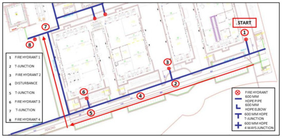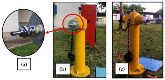 The field measurement experimental work with water pipeline system was 350 m in length from the point of analysis (Figure 5), 60 mm in external diameter, and the pipe materials are High-Density Polyethylene (HDPE). The measurement work on the service pipeline system network was conducted at the Faculty of Mechanical and Automotive Engineering Technology, Universiti Malaysia Pahang (Figure 6). The test was carried out on the maximum range achievable of the service pipeline system in the selected area. The length was nearly five times longer than the laboratory experimental test rig. Each pipe feature was identified and measured through a pipeline blueprint provided by the Department of Property Development and Management, Universiti Malaysia Pahang. The customised fire hydrant cap with a 5 mm diameter circular hole was used as induced damage to simulate the leak response at the two different fire hydrant points (Figure 7b,c) to study the trends of signal response between leaks and the distance from the point of analysis. In particular, the leak was induced through a 5 mm diameter gas connector fitted on a customised fire hydrant cap with working pressure of 3.75 bar and is measured to generate a leaking flow approximately up to 1.4 L/min [33]. In addition, for field authentication, the presence of pipe fittings (elbow, T-joint, valve, fire hydrant, and pipe socket) along the pipeline system were not preventing the detection of the leak but may alter the pressure transient response. This is because the reflection signal acquired during these processes may also be a response from pipe fitting. This condition was much contrasted with the laboratory verification since during signal acquisition, the reflection responses were just created from the leaks. The provided blueprint of the pipeline system is then utilised to identify the signal response acquired. Measurements were performed for both the non-leaking and the leaking circumstances to determine, respectively, the ambient noise and vibroacoustic phenomenon linked to active leaks.