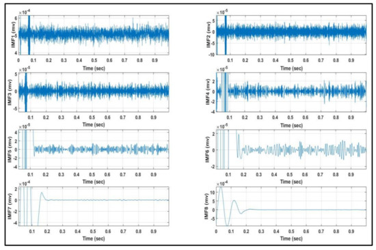 The decomposition by empirical modes (EMD) represents an extremely effective adaptive decomposition compared with other transformations [18]. This method was applicable for non-linear and non-stationary signal processing even though the method of decomposition is predicated on the data scale set for local characteristics [14]. As brevity and summary, only the basic steps of the procedure are presented. For details, more information is in the discussion [14]. EMD generates and decomposes the signal into a series of IMF. The data extraction and decomposition ways are predicated on direct extraction, which can be linear or non-linear as dictated by the data and are almost orthogonal [14]. The first step of the decomposition process is the research of the maxima and minima values along the signal x(t), and all the stationary points are stored.