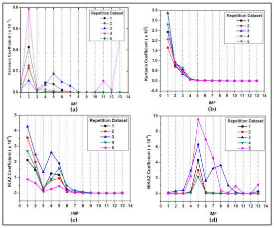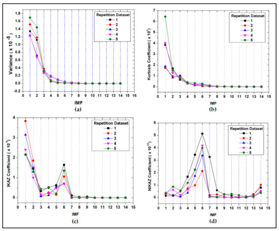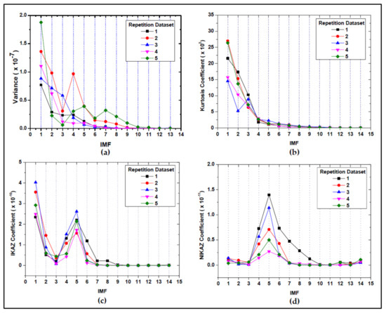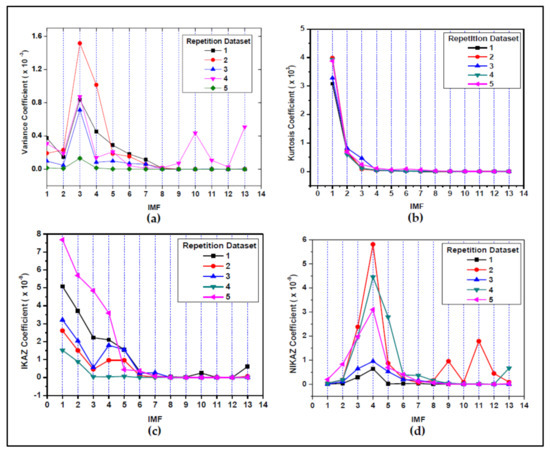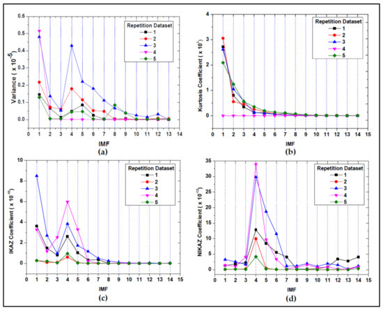 The curve for no-leak IMFs: (a) Variance, (b) Kurtosis, (c) IKAZ, (d) NIKAZ.