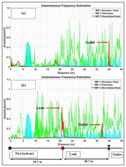 The distance of the reflection from the point of analysis (pressure sensor) is acquired by essentially multiplying the time delay data corresponding to each of the peaks by the speed of sound in the pipeline system (c = 524.30 m/s), and divided by two, that accounts as the return journey [6]. From the observation, it can be seen that there were peaks up to about 0.03 s or 7 m. These can be ignored as they were a part of the analysis process (these can be set to zero using the liftering process) [6]. Referring to Figure 13a and Figure 14a, the peaks appeared on the red line, which represents the HT analysis of IMF 5, and can be described as the pipeline condition, where the peak/spikes appeared at 38.34 m (Figure 13b) and 41.08 m (Figure 14b). Remarking on Figure 13 and Figure 14, the blue and green lines represent the HT analysis of IMF 1 and 2 (Figure 13) and IMF 1 and 3 (Figure 14), respectively. The IMF 1 (blue line) (Figure 13 and Figure 14) was chosen to remark the highest Kurtosis and IKAZ coefficient value; meanwhile, IMF 2 (green line) (Figure 13a and Figure 14a) and IMF 3 (green line) (Figure 13b and b) remark the highest variance coefficient. From the observation on the blue and green lines (Figure 13 and Figure 14), it is hard to conclude and find the possible spikes that represent the leak and pipe outlet since too many spikes appeared on the graph. Referring to [5,18], IMFs series 1–3 were described as high-frequency phenomena which contain rich noise. These IMF series were discarded because they are not physically meaningful and should not be of interest [18]. Therefore, the widespread spikes shown on the blue and green line are commonly spikes representing the noise from the signal; meanwhile, the red line clearly showed the spikes that are representing the reflection of the leak and pipe outlet because, quoting [5], this IMF level is in the range of IMF 4–6 that should consist of the signal without noise. By comparing the results with the measured distance, the presence of peaks on the time and distance represented the reflection signal from the pipe outlet or control valve. Because the pipe outlet and control valve were too close to each other, therefore, the reflection of both features is concluded as overlapping each other.