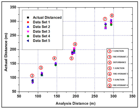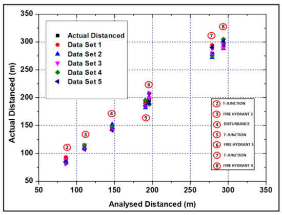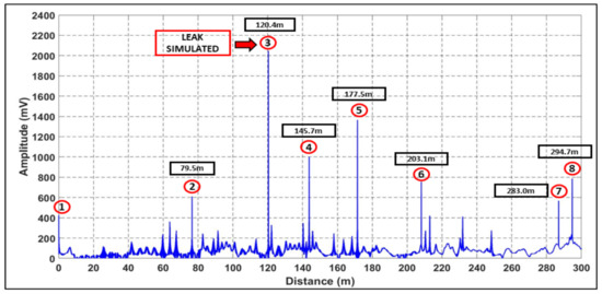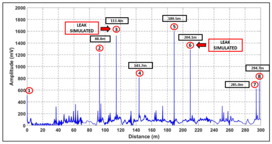 The graph (amplitude (mV) vs. distance (m)) illustrated in Figure 20, Figure 21, Figure 22 and Figure 23 is the instantaneous frequency estimation (from HT analysis) for the pipeline with no-leak condition (Figure 20), 5 mm leak induced on fire hydrant 2 (Figure 21), 5 mm leak induced on fire hydrant 3 (Figure 22), and 5 mm leak induced on fire hydrant 2–3 (Figure 23), respectively. The non-stationary signal is the most beneficial for characterising frequency change at any time during this period with regards to the instantaneous frequency of the signal. Instant frequency is the frequency that locally aligns the signal [12]. The field pipeline system used in the Faculty of Mechanical and Automotive Engineering Technology is a service pipe fixed with various types of pipe fittings such as valve, fire hydrant, junction, and socket, referring to the blueprint provided in Figure 7. For the first 300-metre distance (from fire hydrant 1) analysis, there are seven main features in the pipeline network that produce the reflection waves. The analysed results are based on the time the wave took to move along the pipe network from the reflection points (pipe feature/leak) back to the analysing point (pressure transducer). Each of the reflection spikes’ amplitude presented in Figure 20, Figure 21, Figure 22 and Figure 23 represents the reflection point induced by the leak (Fire hydrant 2 and 3) and pipe feature (junction, valve) fixed along the first 300 m from the analysis point (fire hydrant 1). The distance analysis of reflection amplitude (Figure 20, Figure 21, Figure 22 and Figure 23) was then compared to measured distance from the blueprint of service pipeline system as provided (Figure 6).