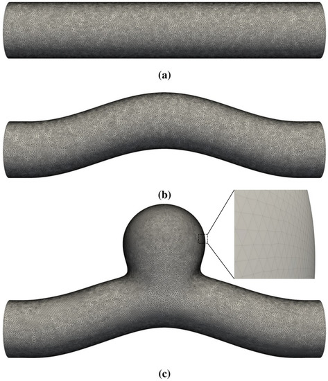 Throughout this study, it was assumed that the fluid (blood) can be represented as an incompressible fluid with uniform density. The continuum assumption is justified by the large diameter of the blood vessel considered in this study (a few millimeters up to centimeters) as compared to the typical size of the particulate objects (red blood cells, platelets, and white blood cells, which typically lie in the range 2–20 μm). Thus, the particulate properties [36,37] of the blood were not considered here. We thus sought to solve the underlying Navier–Stokes equations in the incompressible limit. It is noteworthy that the methodology implemented here—the lattice Boltzmann method (LBM)—allows for a small, but finite numerical compressibility. It turns out that this feature is not necessarily a drawback. Rather, if used adequately—e.g., by introducing multiple relaxation times (MRTs) within LBM; see Section 3—it may lead to better stability of the numerical scheme.