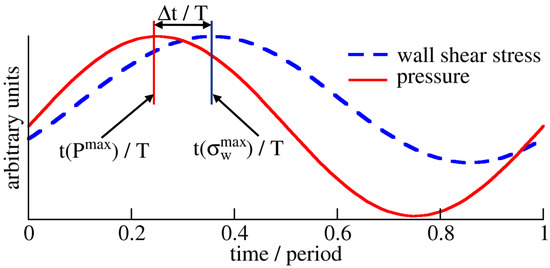 where and , respectively, indicate the peak pressure and WSS times within one cardiac cycle of duration T (Figure 2). The phase shift is positive when the pressure signal reaches its maximum before the WSS signal and negative if the pressure lags behind the WSS.