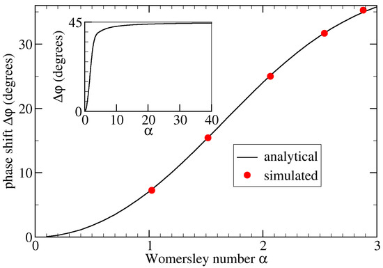 The analytical data (black line) are obtained via Equation (5) using a Python script. In simulations using the geometry shown in Figure 1a, we alter the viscosity and/or period T to control . The simulated phase shift is averaged over the entire tube wall (red circles). We observe an excellent agreement, with the maximum numerical error being less than 2%. The inset shows the analytic result for large , suggesting that for .
