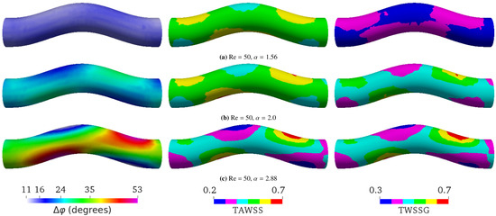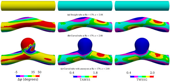 Figure 4 and Figure 5 show that the effect of geometry on , the TAWSS, and the TWSSG is enhanced when the Womersley number and/or Reynolds number Re increase. Compared to the straight vessel, the phase shift increases at the inner bend of the curved vessel and inside the aneurysm dome. The strongest effect of geometry on was observed in a curved tube containing an aneurysm, where the spatial behavior of becomes highly irregular (Figure 6c). This behavior must be caused by the complex flow field, including nontrivial backflow effects, that prevails in the aneurysmal dome.