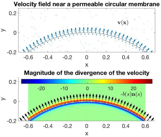 General setting of the problems considered in this article. The figure shows a section of a circular permeable membrane. The top panel shows a neighborhood of the membrane and the velocity field across the membrane from the inside to the outside. This flow is generated by a distribution of source doublets on the membrane, with and is the outward unit normal. The bottom panel shows the vectors (black arrows) and the divergence of the velocity (colormap).