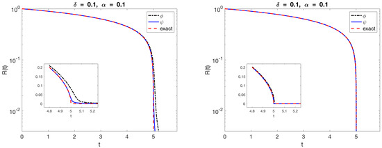 Based on the calculation of , we set and computed numerically the solution of the single differential equation with , corresponding to the blob . The solution using and is compared with the exact solution in Figure 2.