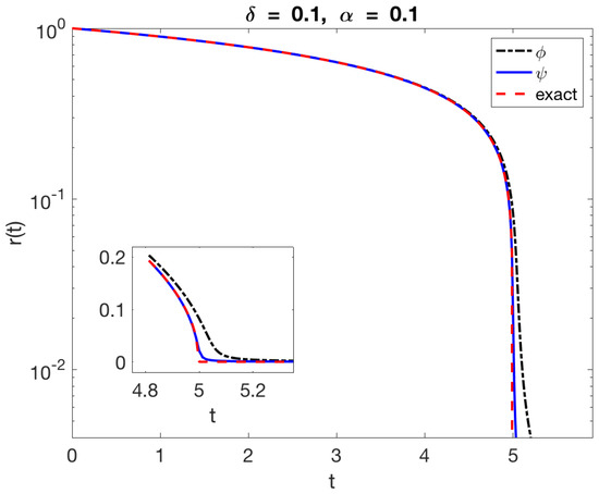 Computation of the radius of the circle using the method in Equation (13) and the two blobs (dash-dot) and (solid) from Table 1. The dashed curve is the exact solution of the problem. The radius is shown in logarithmic scale to appreciate the difference between the solutions. The inset shows the results in linear scale near , when the exact solution shrinks to a point.